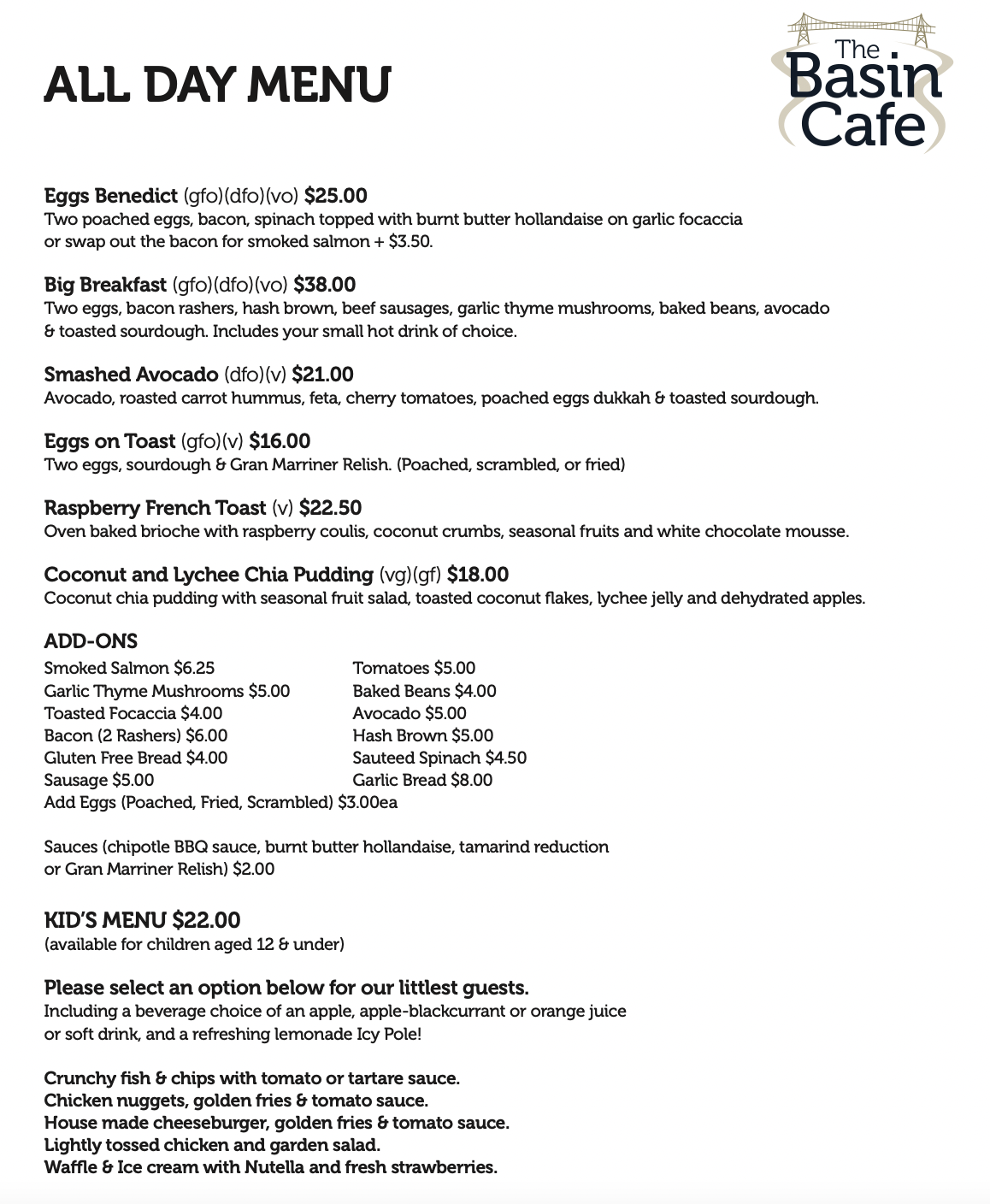 BASIN CAFÉ MENU
