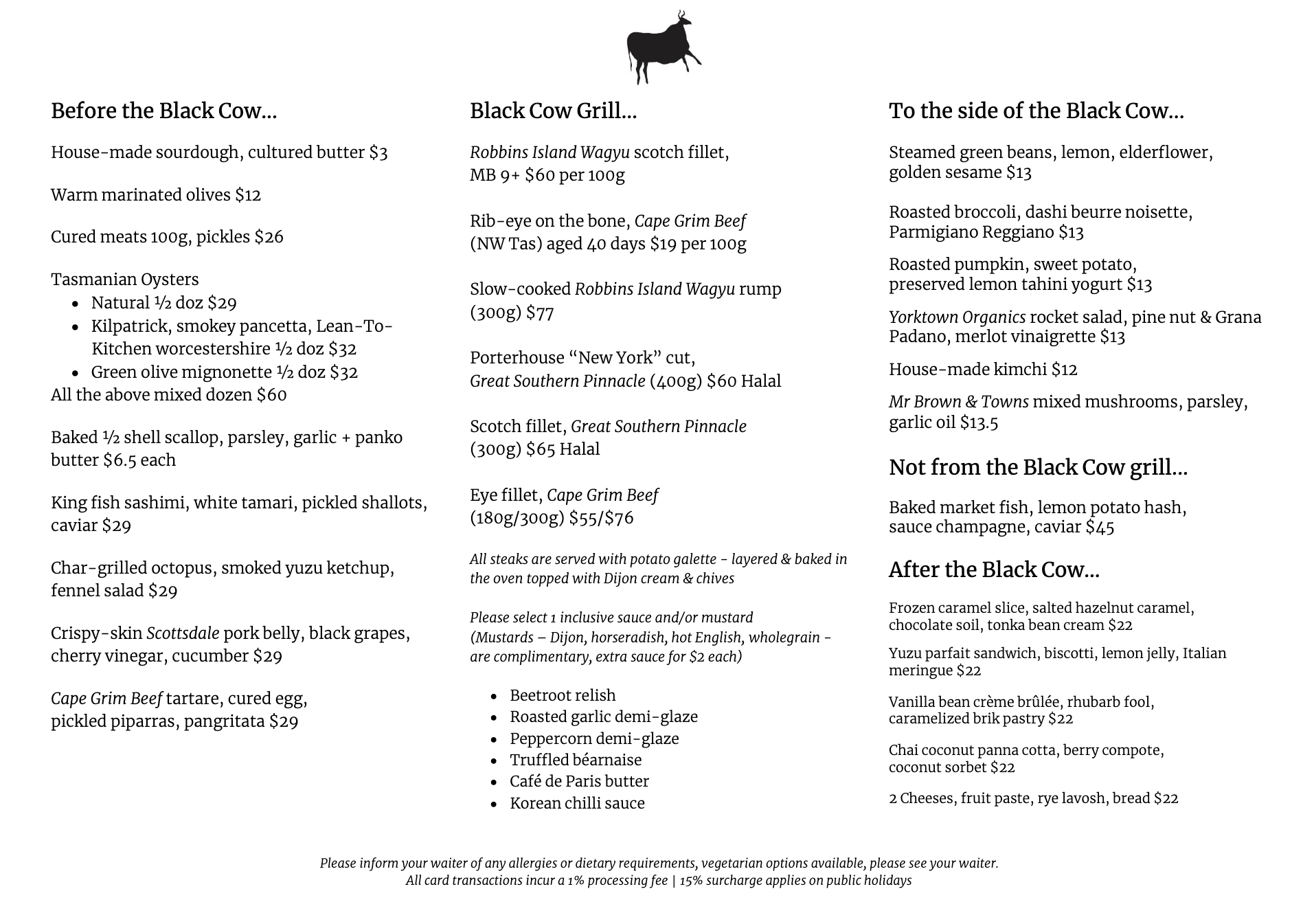 Black Cow showcases premium dry aged, free range, grass fed, hormone free Tasmanian beef. The steaks offer a range of flavours and tenderness. From the most delicate and lean eye fillet and fat studded Scotch to the heartyrrib eye and our more textured porterhouse and rump, just full of flavour.