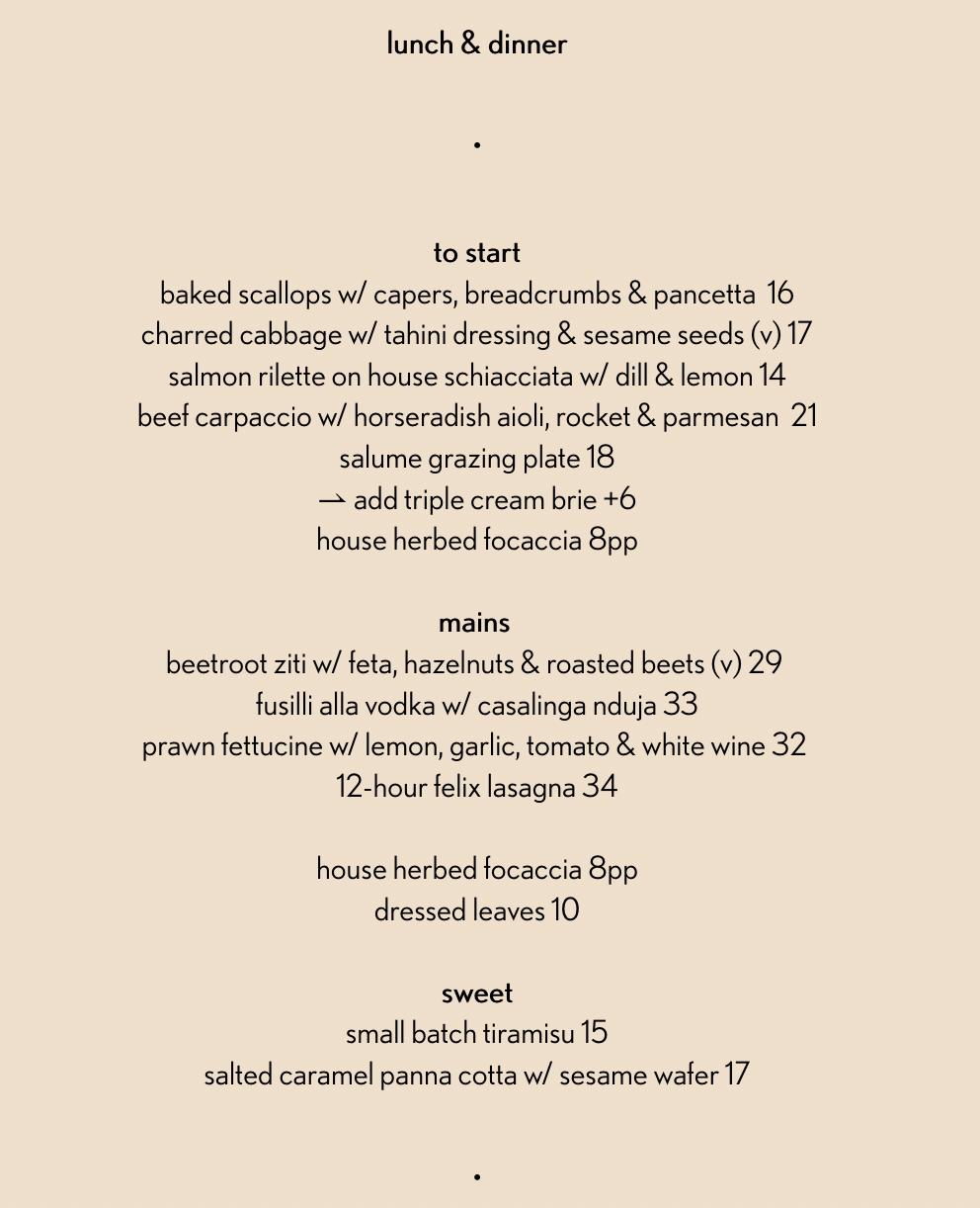 Felix Espresso Wine & Pasta Bar opens for a day service as a breakfast brunch venue and by night as a Pasta & Wine Bar.