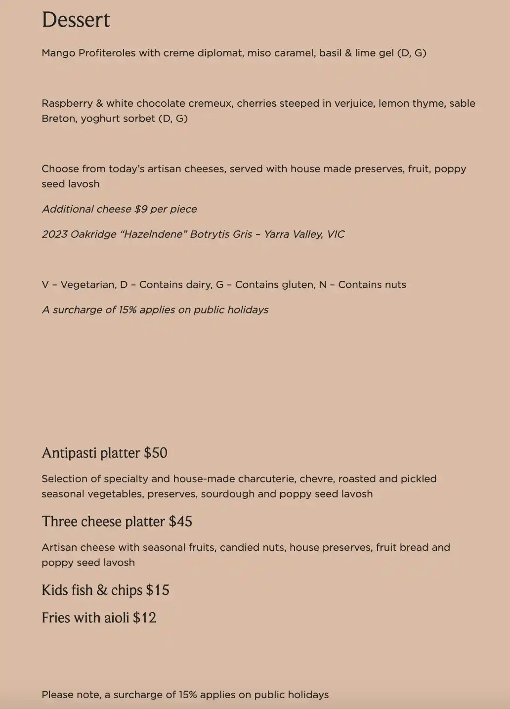 Includes a choice of 2 or 3 courses for $85 / $100 per person. Bookings essential. Kids menu available. PUBLIC HOLIDAYS 15% surcharge applies.