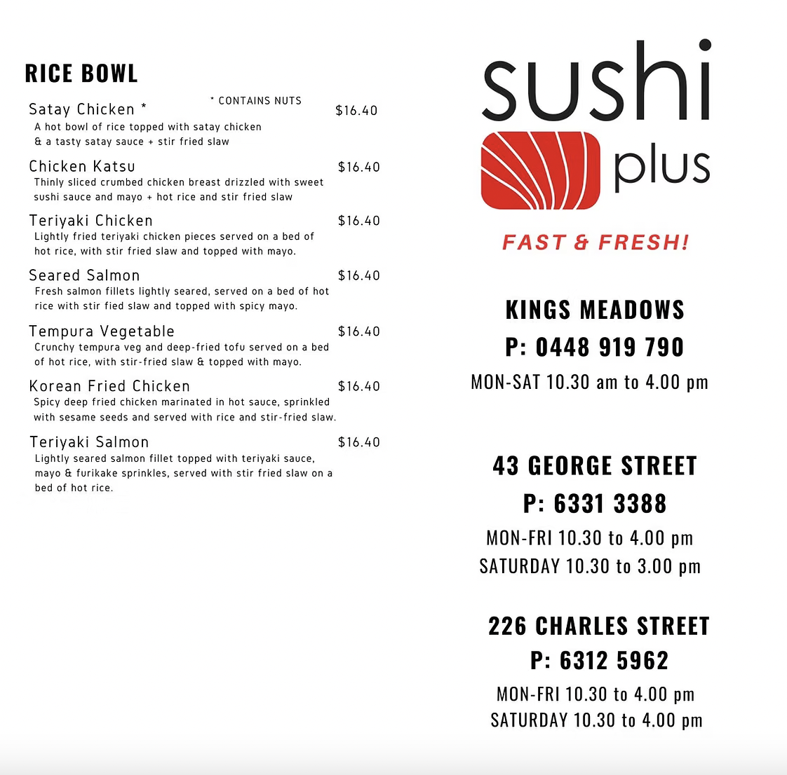 “Sushi Plus is proud to be a Tasmanian owned business – our philosophy is simple – freshly made, ready to go Sushi & Rice Paper Rolls PLUS fast & friendly service!”