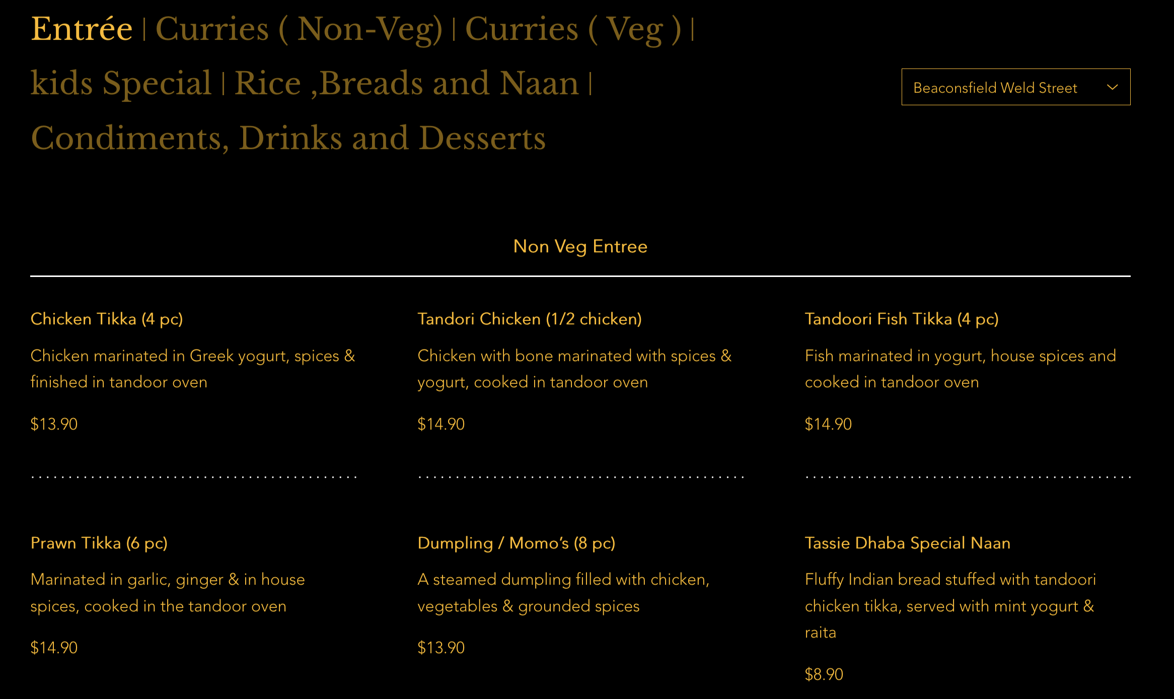 Listings >> Take Away Food >>Home Delivery >>Indian >>Out of Town >>Dinner >>Beaconsfield TASSIE DHABA INDIAN Indian Restaurant - Beaconsfield, Tasmania (03) 6300 8106 HOURS: Tue-Sun. 11:30 am - 8:30 pm Monday: CLOSED Tassie Dhaba Tassie Dhaba Indian 102 Weld Street BEACONSFIELD Tas. 7270 (03) 6300 8106 tassiedhaba@gmail.com Tassie Dhaba Café & Indian Cuisine is located in the Main Street of Beaconsfield, offering all the traditional Indian favourites one can expect. TASSIE DHABA MENU as at 05 Jan. 2025 Photo gallery All photos (4) Recent Posts COINSPOT – Buy, Swap & Sell Join to Receive $10 Bitcoin Credit Photo gallery All photos (4)